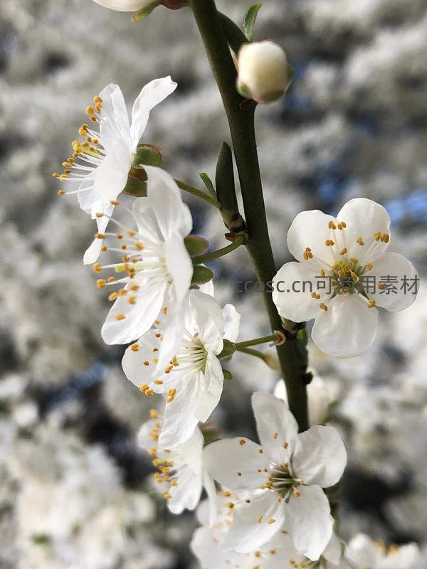 洁白无瑕的梅花在枝头盛放,金黄色的花蕊清晰可见,背景虚化突出主体,尽显早春清雅脱俗的自然之美。