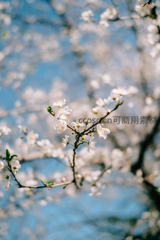在湛蓝天空的映衬下,一枝洁白的樱花迎风绽放,背景虚化营造出梦幻感,尽显春日盎然生机与纯净之美。