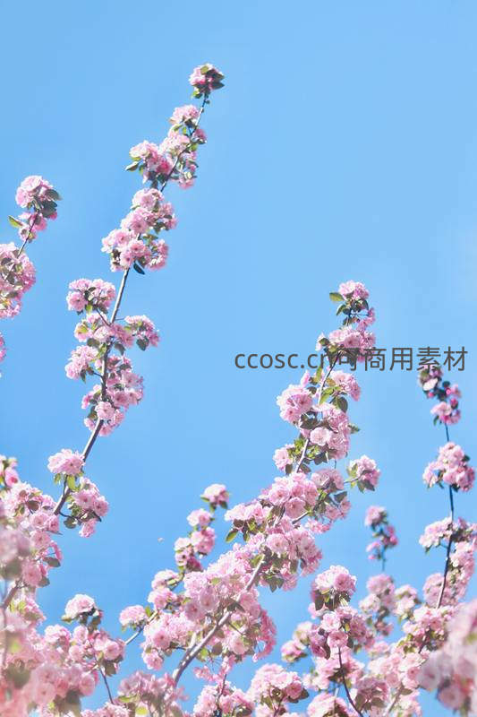 仰视视角下,粉白樱花枝条伸向湛蓝天空,朵朵繁花如云似霞,营造出纯净、开阔又充满诗意的春日画面。
