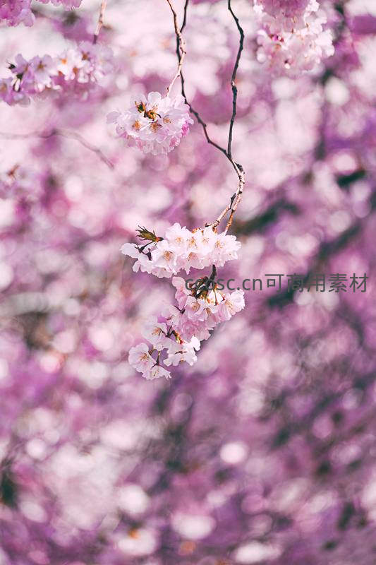 近距离捕捉一簇垂下的樱花,花瓣娇嫩欲滴,背景被柔化成梦幻般的紫粉光斑,凸显花朵的精致细节,营造出温柔静谧的视觉享受。