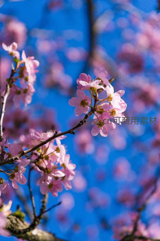 前景中几朵粉色樱花清晰绽放,背景则是梦幻般的蓝色虚化光斑,虚实结合营造出迷人的视觉层次和浪漫唯美的艺术氛围。