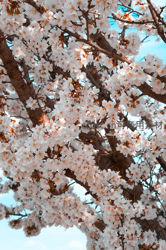 近距离捕捉樱花的精致细节,洁白的花瓣与深褐色的枝干形成鲜明对比,阳光透过花丛,展现出生命最细腻温柔的一面。