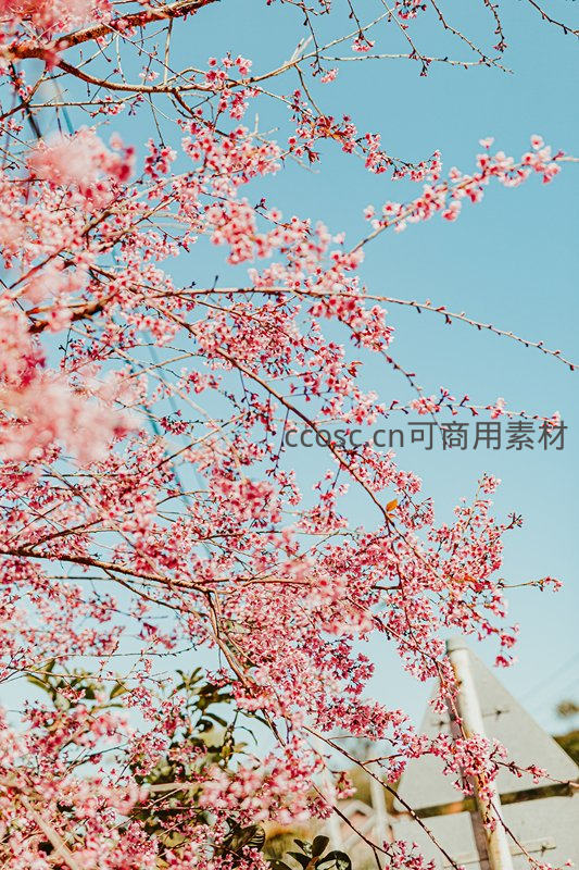 粉红色的樱花在晴朗的蓝天下盛开,枝条交错,花瓣繁密,展现出浓郁的春日气息与自然之美。
