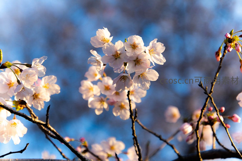在湛蓝天空的背景下,一簇簇洁白的樱花在枝头盛放,花瓣细腻柔美,阳光透过花隙洒落,营造出宁静而唯美的春日氛围。