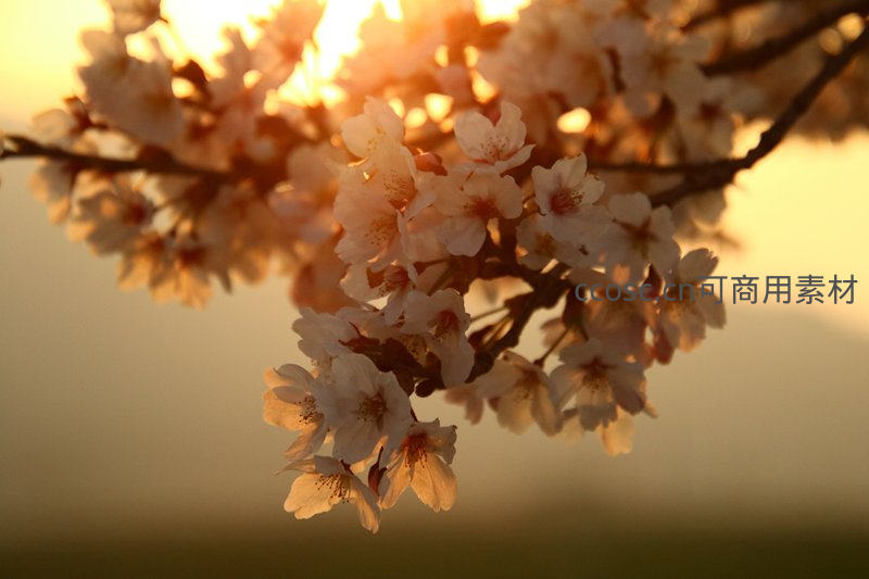夕阳西下,金色的光线穿透繁茂的樱花枝头,形成温暖而朦胧的逆光效果,花瓣边缘泛着金边,整个画面充满诗意与浪漫气息。
