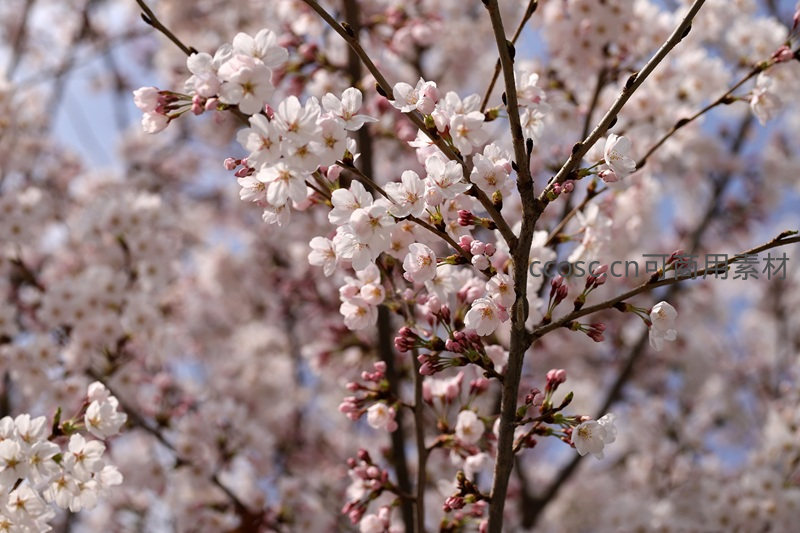 粗壮的枝干上缀满洁白与淡粉的樱花,层层叠叠,背景虚化更显花团锦簇,春意扑面而来,生机勃勃。