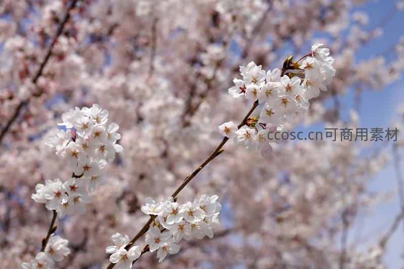 一枝洁白的樱花在春风中轻轻摇曳,背景是朦胧的花海与湛蓝的天空,画面宁静而优雅,春光无限美好。