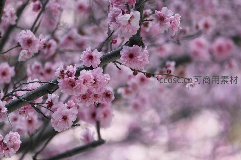 淡粉色的梅花簇拥在深色枝干上,背景朦胧,整体色调柔和静谧,展现出早春时节独有的温婉与诗意。