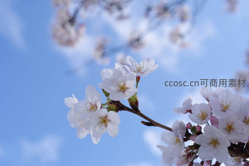 洁白的樱花在蔚蓝天空下绽放,花瓣细腻通透,花蕊金黄,仰拍视角更显其高洁纯净,充满生机与希望。