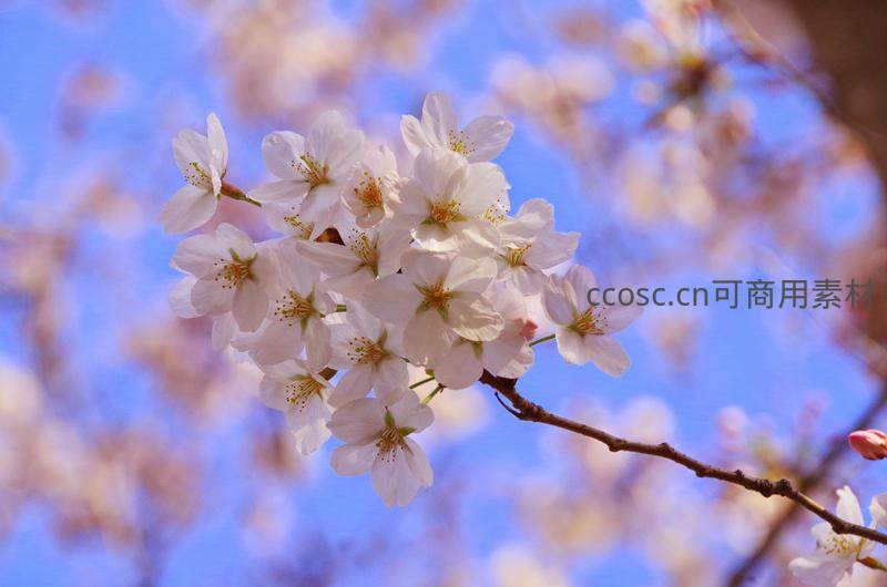 一簇簇洁白的樱花在枝头绽放,背景是纯净的蓝色天空,构图简洁优雅,传递出春日里宁静而美好的视觉享受。