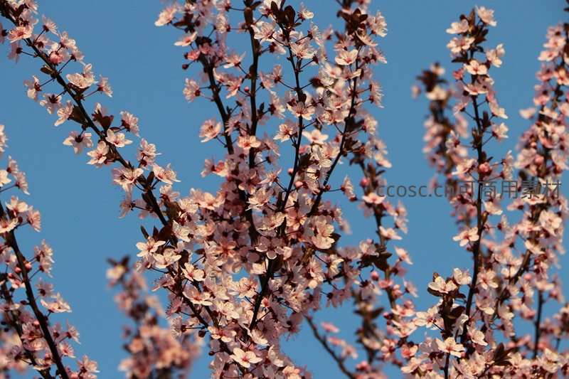 在清澈湛蓝的天空背景下,一簇簇粉白相间的花朵在枝头竞相绽放,花瓣轻盈柔美,展现出春日生机与自然之美。