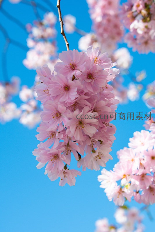 一串串粉嫩的樱花从枝头垂落,在纯净蓝天的映衬下如云似霞,花瓣层层叠叠,随风轻摇,营造出梦幻唯美的春日景象。