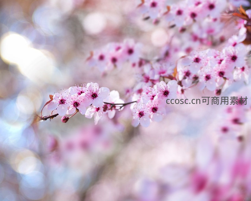 在温暖柔光的笼罩下,粉红色的花朵枝条呈现梦幻般的朦胧美感,背景光斑闪烁,仿佛置身童话世界,宁静而浪漫。