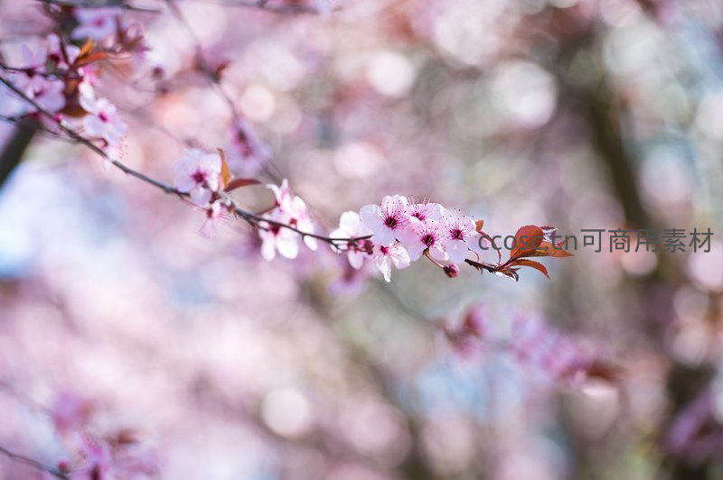 一根缀满浅粉色小花的枝条在柔焦背景中静静伸展,花瓣细腻精致,光线柔和,营造出宁静、温馨、充满诗意的春日氛围。