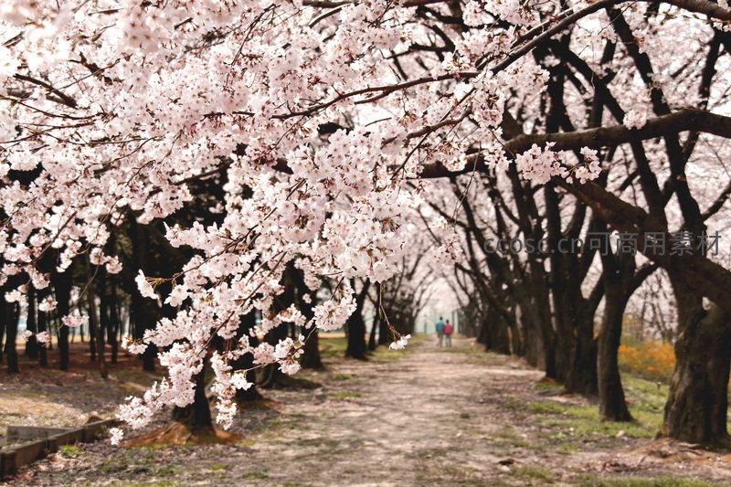 一条被茂密樱花树冠覆盖的小路,形成天然的“樱花隧道”,远处行人悠然穿行其中,营造出梦幻般的浪漫氛围与诗意的春日景象。