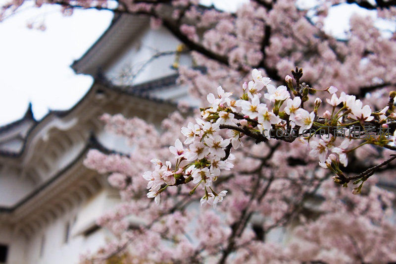 粉嫩的樱花枝条在镜头前盛开,背景是庄严的日本古堡飞檐,古典建筑与柔美花海相映成趣,展现东方春日的诗意画卷。