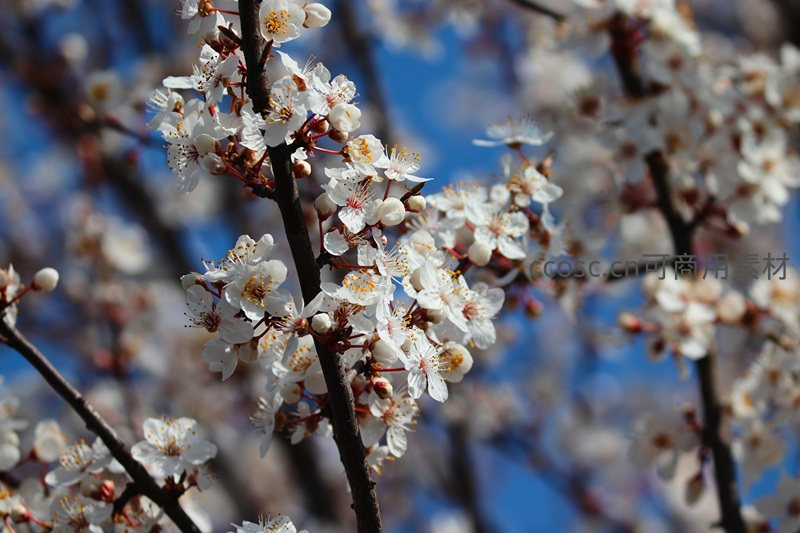 在湛蓝天空的映衬下,一簇簇洁白的杏花在深褐色的枝条上竞相开放,花瓣娇嫩,花蕊金黄,充满了春天的气息与生机。