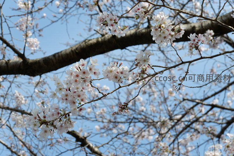 粗壮的深色树干横亘画面,细小的枝条上点缀着洁白带粉的樱花,在纯净的蓝天背景下,展现出一种宁静而优雅的自然之美。