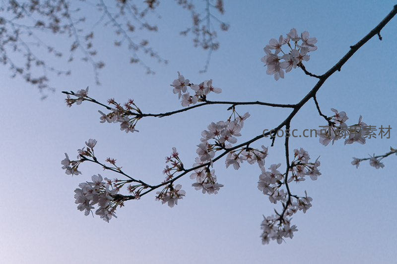 在渐暗的暮色天空下,一枝樱花静静绽放,粉白花瓣与深色枝干形成柔和对比,营造出静谧唯美的春日氛围。