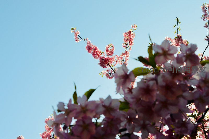 明媚阳光穿透繁茂的粉色樱花,在纯净的蓝天下形成一片绚烂花海,绿叶点缀其间,尽显春日蓬勃的生命力。