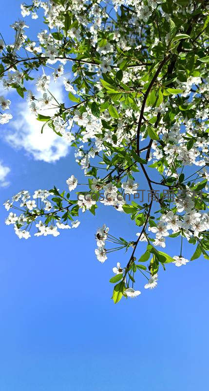 洁白的花朵与嫩绿的新叶在湛蓝天空的映衬下显得格外清新脱俗,仰拍视角捕捉到春日里最纯净、最富有生命力的瞬间。