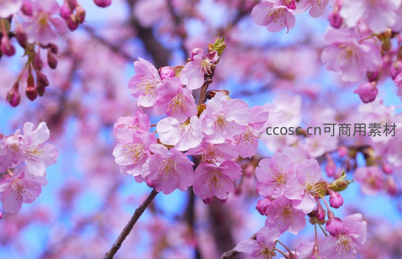近距离捕捉粉樱绽放瞬间,清晰可见细长花蕊与柔美花瓣,蓝天背景衬托出花朵的精致与活力。