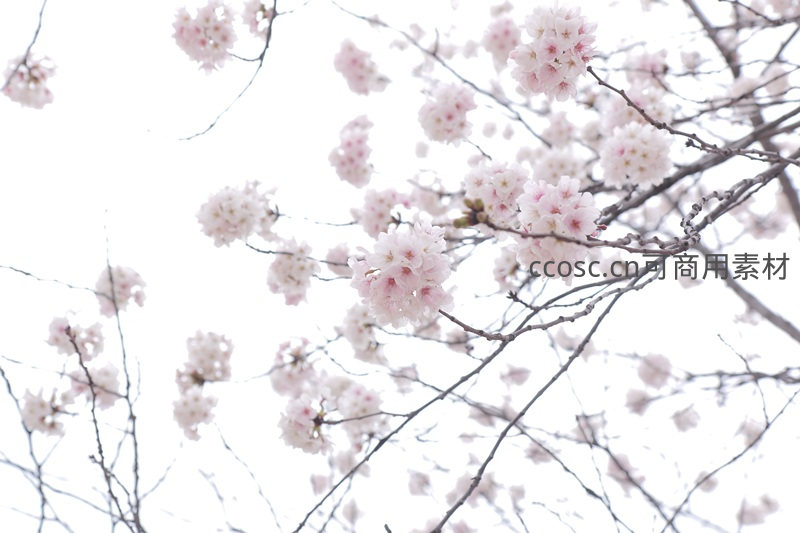 从低角度仰望,粉嫩的樱花在灰白天空背景下如云朵般绽放,纤细枝干交错,营造出轻盈、诗意的春日视觉体验。