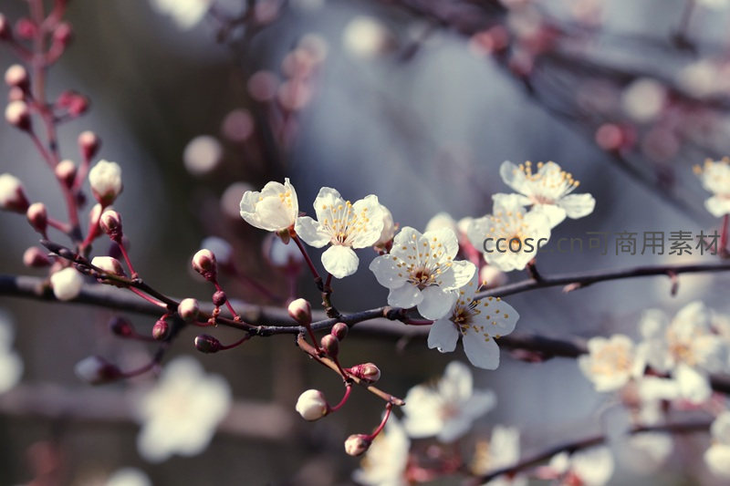 微距镜头捕捉到初绽的白色梅花,花瓣晶莹剔透,花蕊金黄,与深红枝条和含苞花蕾相映成趣,散发出清幽淡雅的早春气息。