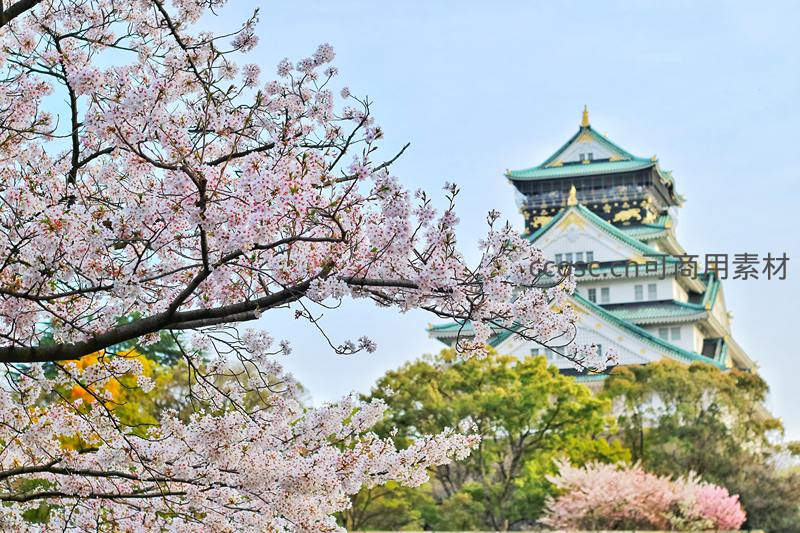 前景是盛放的樱花枝条,背景是宏伟的大阪城天守阁,传统建筑与自然美景交相辉映,展现日本春季特有的历史与人文风情。