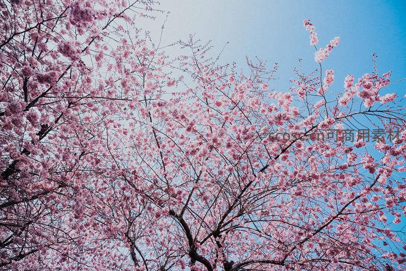 从低角度仰拍盛开的樱花树,粉嫩的花朵在湛蓝天空下显得格外娇艳,枝干交错,充满生机与诗意。
