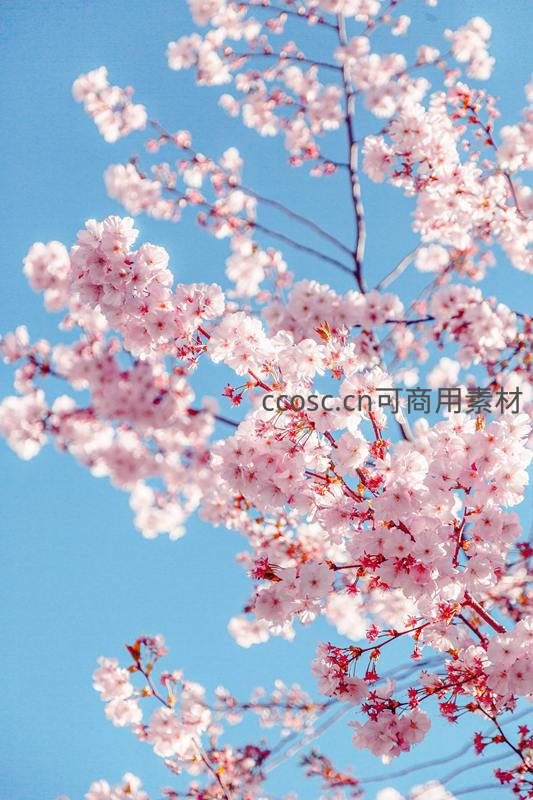 从低角度仰望满树樱花,粉白花瓣在湛蓝天空下绚烂绽放,枝条交错间透出明媚春光,充满生机与希望。