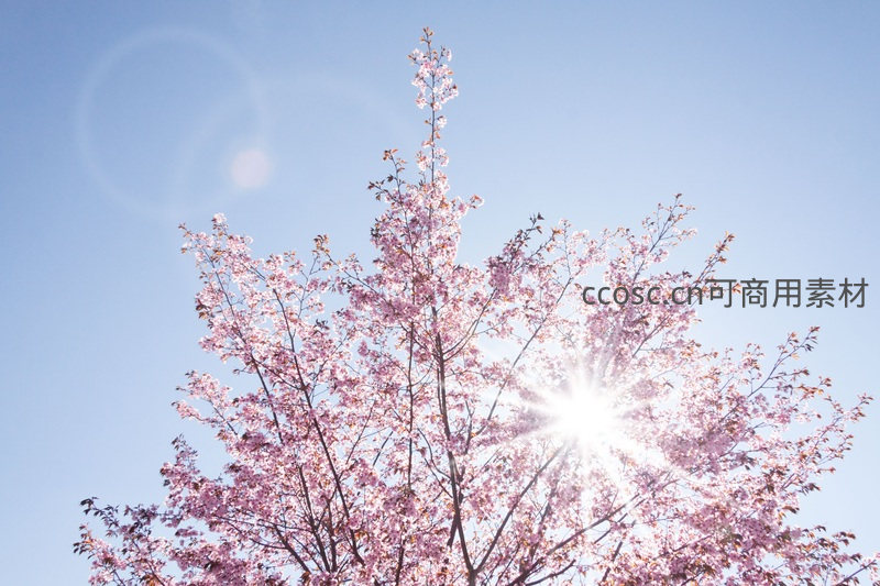 正午阳光穿过繁茂的樱花树冠,形成耀眼星芒与柔和光斑,粉红花朵在强光下更显通透,展现春日热烈与活力。