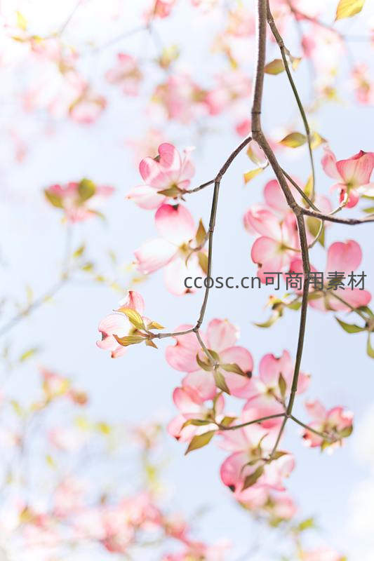 仰视视角下,粉嫩花朵缀满纤细枝条,新叶初萌,淡蓝天空为背景,光线柔和,整体画面充满蓬勃生机与清新浪漫的春日气息。