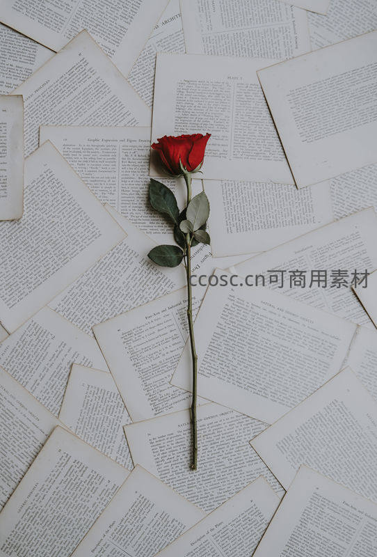 一朵鲜艳的红玫瑰静静躺在散落的书页上,花瓣娇艳欲滴,与泛黄的文字形成诗意对比,营造出浓郁的文艺与浪漫氛围。