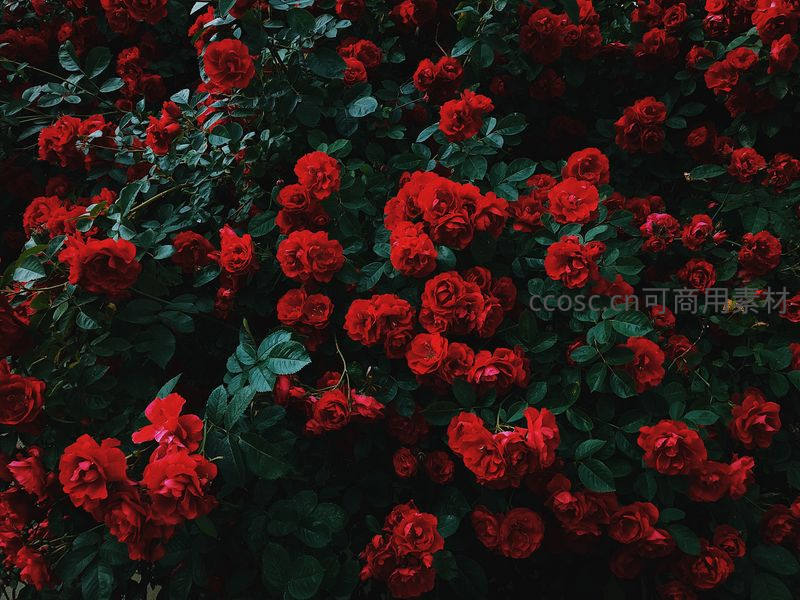繁茂的红玫瑰丛,绿叶掩映下的热情盛放