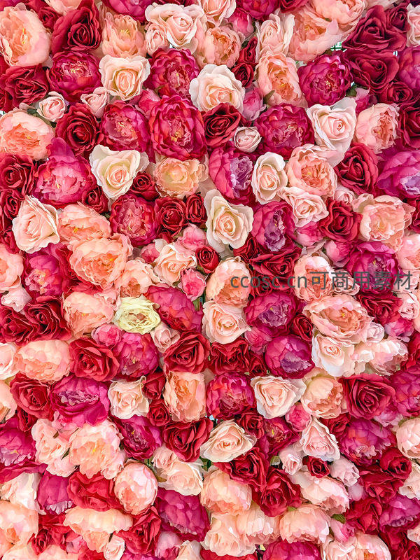 由无数朵盛开的玫瑰组成的绚丽花墙,粉红、桃红与深红的花瓣层层叠叠,营造出浓郁浪漫的氛围,适合用作婚礼或庆典背景。