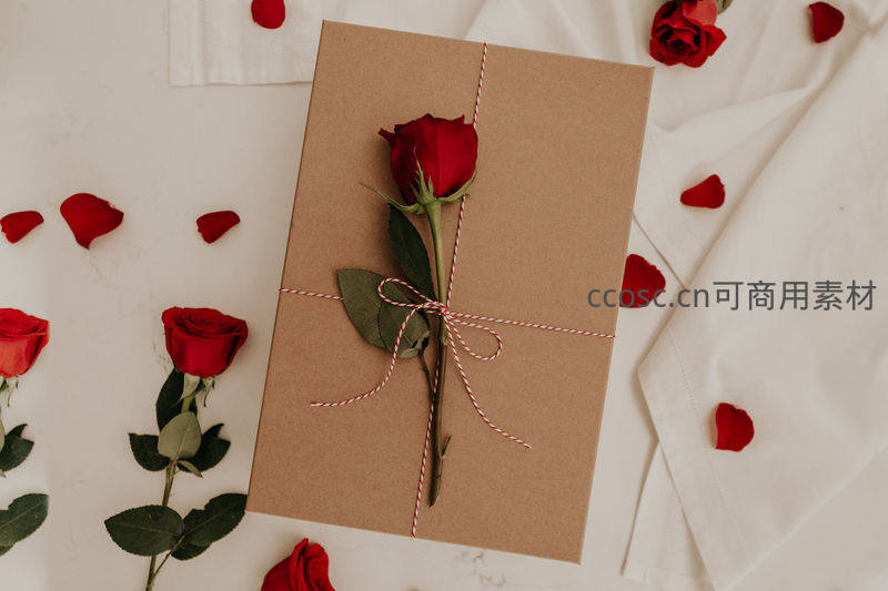 一枝红玫瑰被红白细绳系在牛皮纸礼盒上,周围散落着花瓣与绿叶,营造出温馨浪漫的氛围,是表达心意与庆祝节日的理想场景。