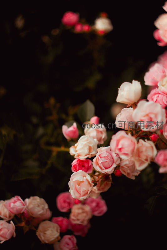 在深色背景的映衬下,一簇粉白相间的玫瑰花优雅绽放,花瓣层叠,光影柔和,营造出静谧而浪漫的氛围。