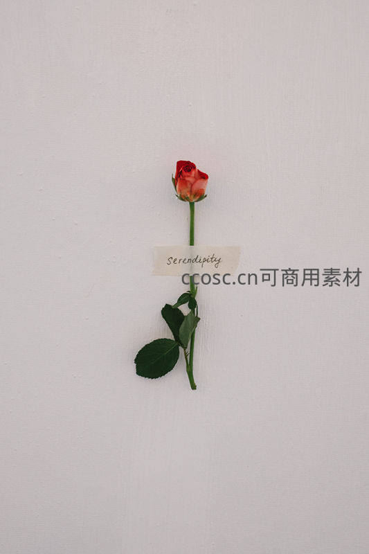 一支孤傲的红玫瑰被固定在纯白墙面上,茎上贴有写着“Serendipity”的纸条,传递着偶然相遇的美好与诗意情怀。