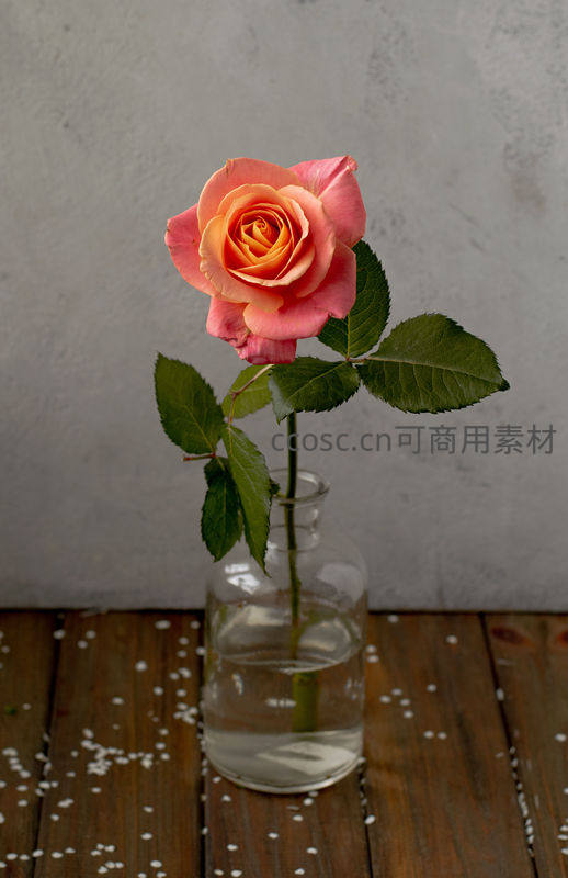 粉橙玫瑰静置于玻璃瓶中,木质背景显雅致