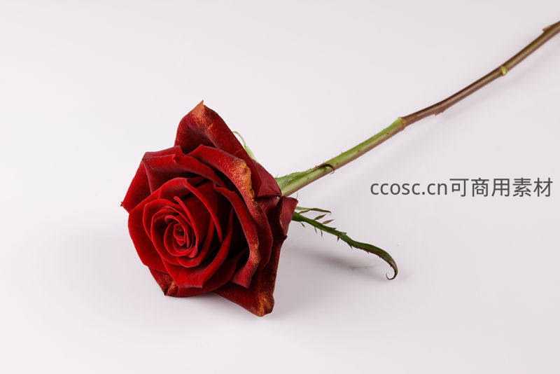 一朵深红色的玫瑰花,花瓣层层叠叠,边缘略带枯萎,斜倚在纯净的白色背景上,展现出一种静谧而略带忧伤的美感。