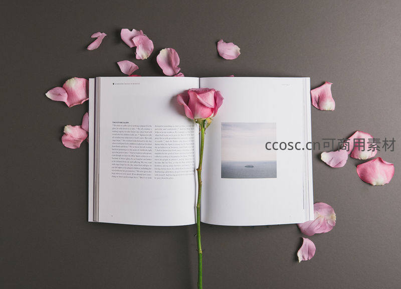 一本摊开的书籍中央放置着一支娇嫩的粉色玫瑰,周围散落着几片同色花瓣,营造出宁静、文艺且富有诗意的生活美学场景。