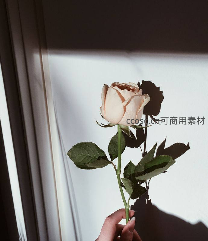 一只手轻握着一支淡粉色玫瑰,阳光从窗边洒下,在洁白的墙壁上投射出花朵与叶片的清晰阴影,画面温柔而富有生活气息。
