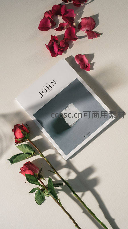 几枝红玫瑰与一本封面为“JOHN”的杂志并列摆放于白色平面上,阳光投下清晰影子,构成一幅简约现代的静物美学画面。
