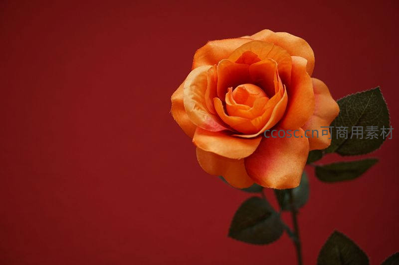 一朵橙色玫瑰在深红色纯背景前独立绽放,色彩对比强烈,构图极简而富有艺术感,展现现代美学风格。