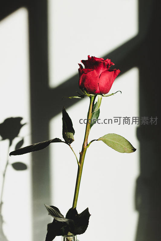 一枝鲜红玫瑰在窗边光影下挺立,明暗对比强烈,投射出诗意的剪影,象征永恒的经典与热烈的情感。