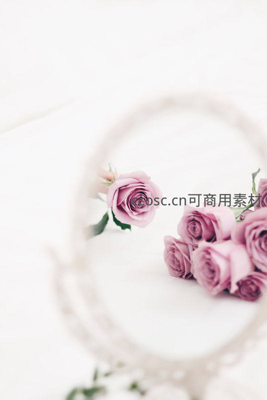 几朵淡紫色玫瑰散落在白色台面上,前方圆形镜子模糊反射花朵轮廓,整体画面简洁梦幻,充满诗意与女性柔美气质。