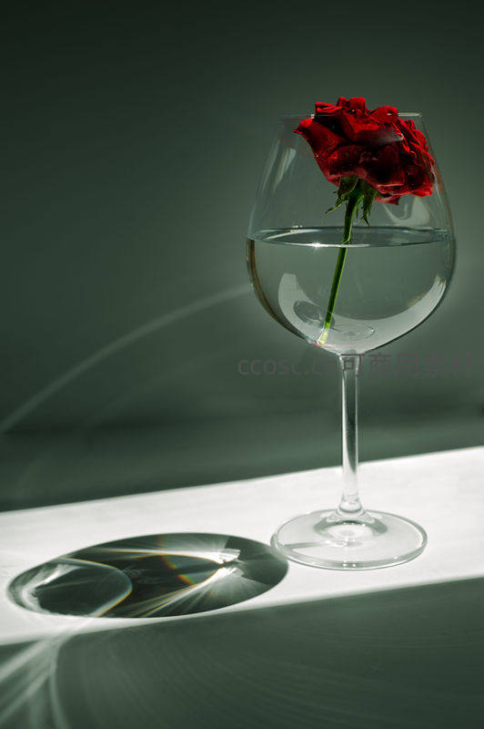 红酒杯中的红玫瑰光影