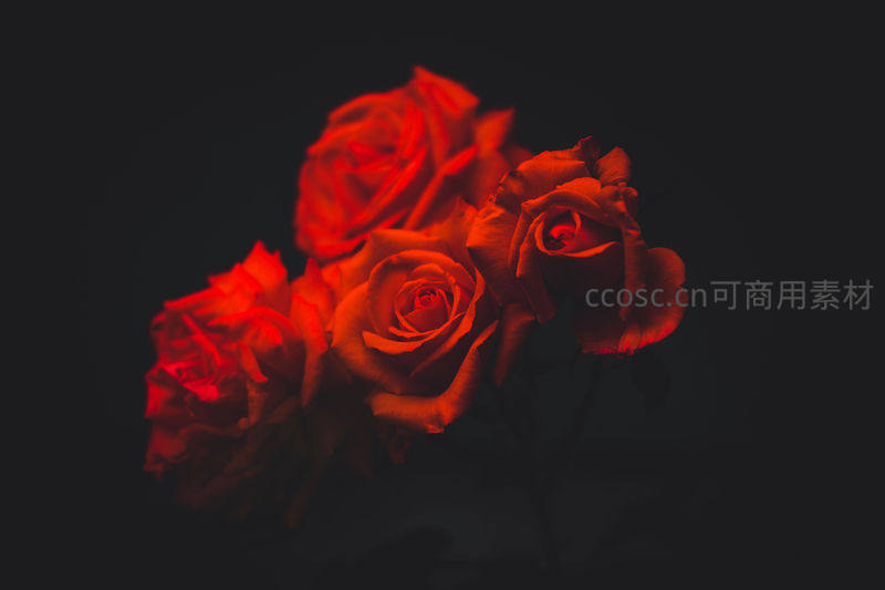 三朵红玫瑰在昏暗光线下静静绽放,暖色调的光线勾勒出花瓣的轮廓,营造出一种私密、温暖且充满情感的艺术氛围。