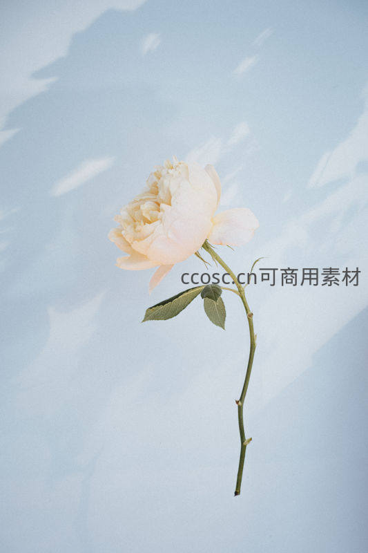 一支洁白的玫瑰花茎挺立于浅蓝色背景前,柔和的光影与花瓣的细腻纹理相得益彰,传递出纯净、宁静与高雅的视觉感受。